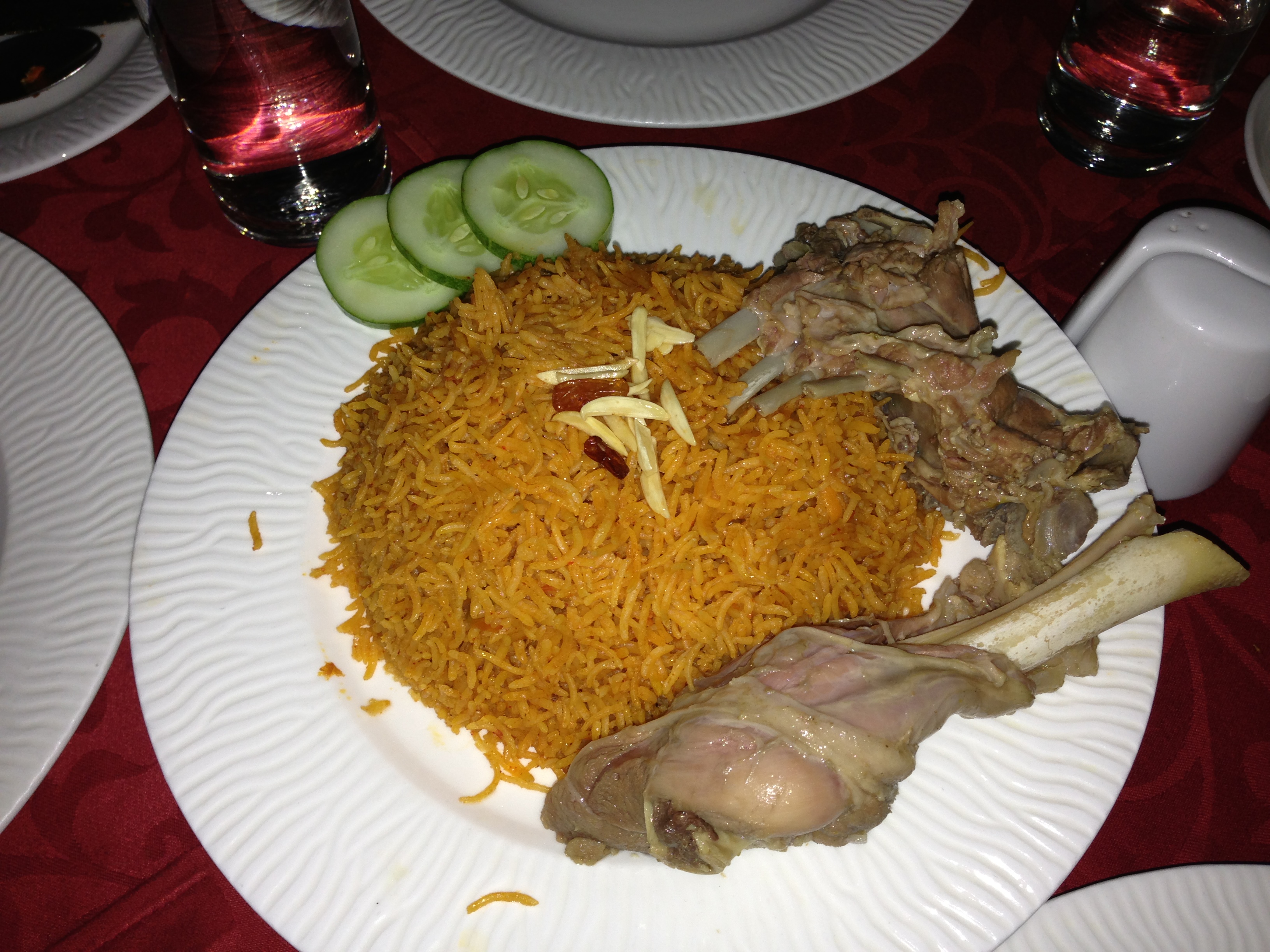 This was eaten at a Muslim restaurant, therefore is commonly found throughout the Middle East as well. It was slow-cooked stewed lamb with basmati rice. The spices were so complex and involved. Had to verify on Wikipedia and it looks like common spices are black pepper, cloves, cardamon, saffron, cinnamon, bay leaves, nutmeg, and black lime.
