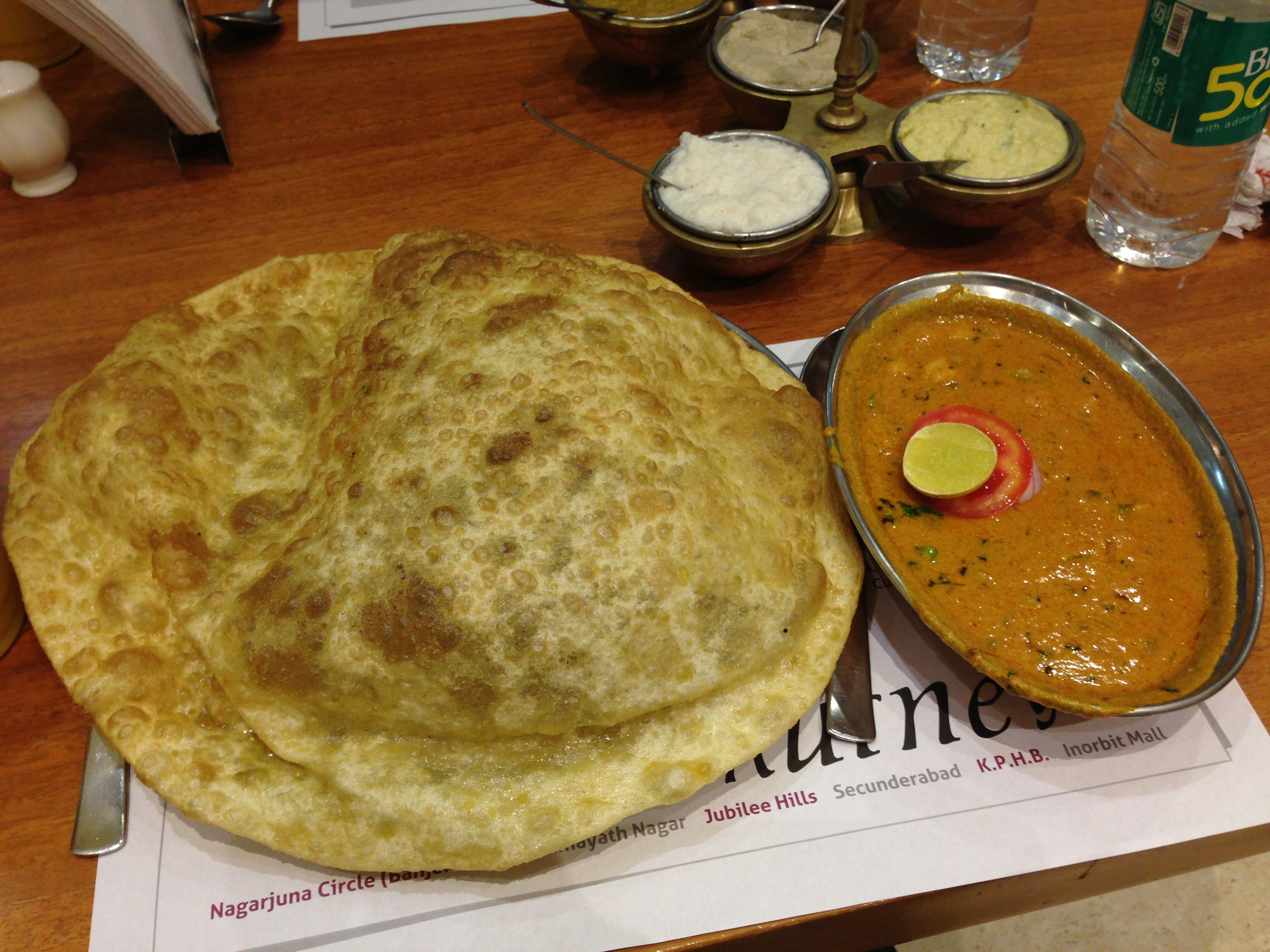 It’s like eating a giant dough puff. The interior is hollow, but the bread is massive and deep fried. Usually served with a side of curry, the bread is meant to be ripped apart and used to eat with the curry.